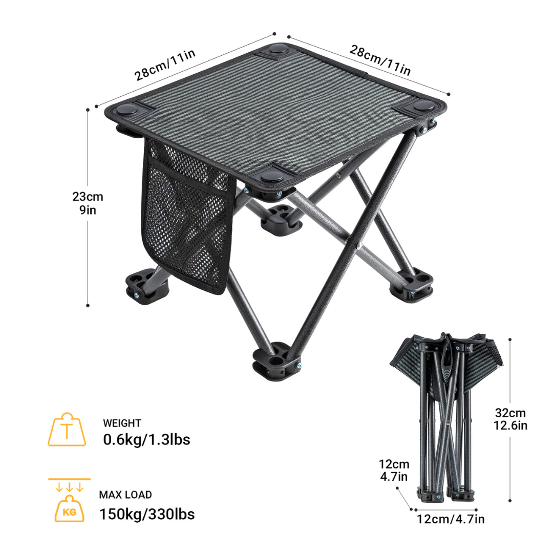 שולחן קפה/ שרפרף קומפקטי וקל במיוחד, אידיאלי לטיולים, קמפינג, חוף הים או פיקניק. עשוי מבד פוליאסטר אוקספורד מצופה PVC עמיד וקל לניקוי, עם שלדת פלדה חזקה ויציבה. מתקפל לגודל קטן ונכנס לתיק נשיאה מבד אוקספורד (210D) לנשיאה קלה ואחסון פשוט. למרות משקלו הנמוך (600 גרם בלבד), הוא חזק ויכול לשאת עד 150 ק״ג.